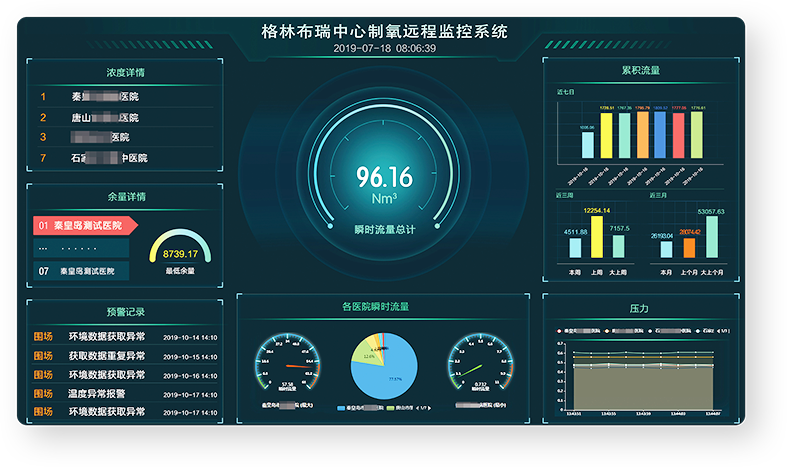 监控系统可对供氧压力、瞬时流量、累计流量等各项数据进行实时监控。 而且有参数异常自动报警功能,真正意义实现了人工智能无人值守机房。