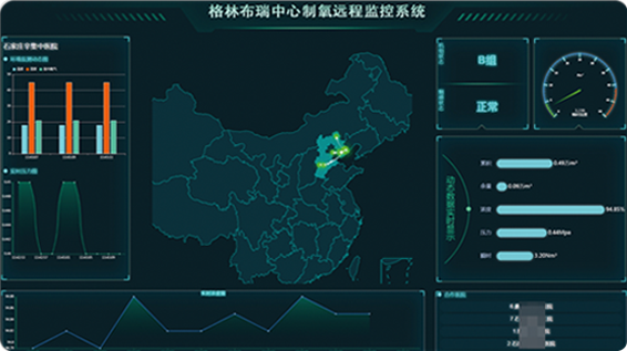 远程监控系统采用集团+单机方式进行数据实时监控,集团监控可同时显示数个设备的重要数据 (机组状态、浓度、压力、异常报警等),并且还有切换九宫/四宫格视图模式、定制显示功能、异常显示功能, 让操作人员轻松预览所有设备。单机监控可以查看单个设备内所有机组的全部数据,采用工业流程图模式显示机组状态与数据, 并带有快速查看/操作功能,方便、快捷、高效。为设备配备硬件拓展(摄像头、烟感、氧气浓度传感器等),可实时监控机房情况。